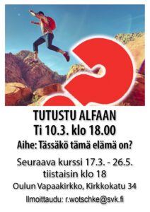 Alfa-kurssi on kymmenen viikkoa kestävä kurssi, jossa keskustellaan elämän suurista kysymyksistä kiinnostavien alustusten pohjalta, maittavan tarjoilun äärellä. Kurssi on ilmainen.